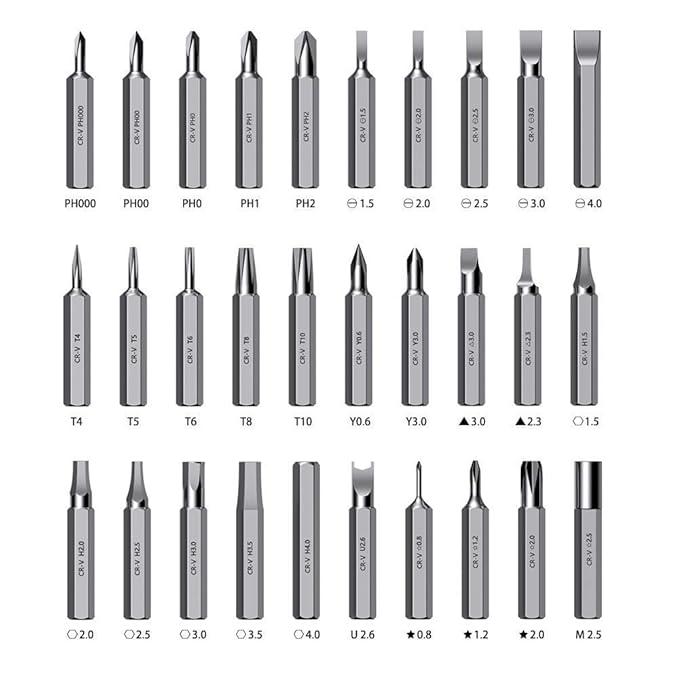 screwdriver with matched 1 extension magnetic connector and 30 bit for repair many type of devices such as toys,games machine,camera, cell phone, laptop and others, very useful for home.