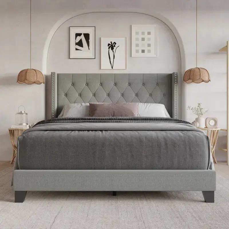 Button tufting headboard with wingback design features nailhead trimming along the sides to give a luxurious look